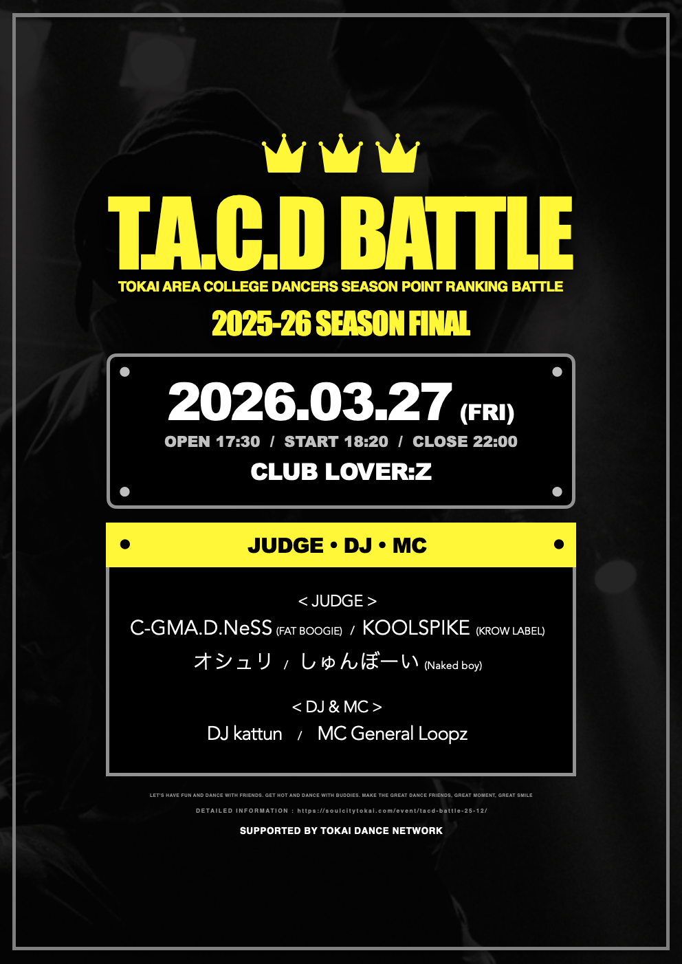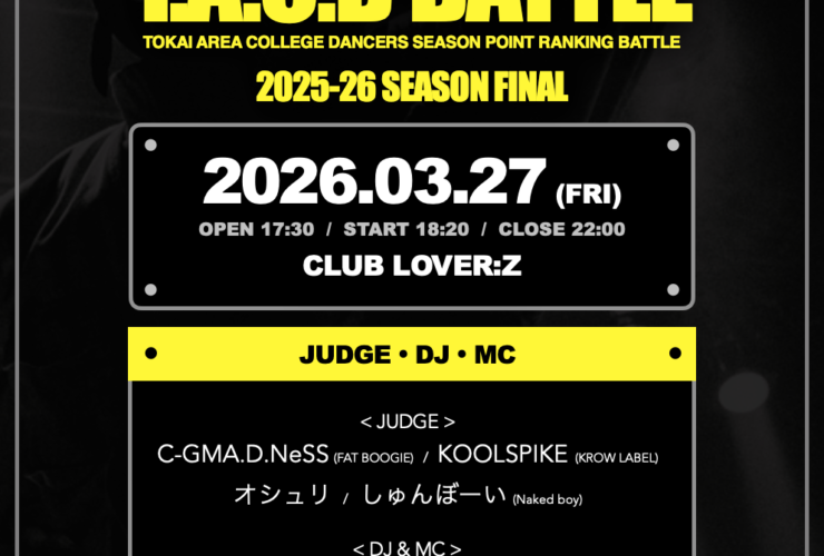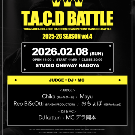 2月082026 BATTLE T.A.C.D BATTLE 2025-26 SEASON vol.4 東海地区で活動する大学生 / 院生 / 専門学生 / 22歳以下の社会人ダンサーなどを対象にした人気バトルイベント『...