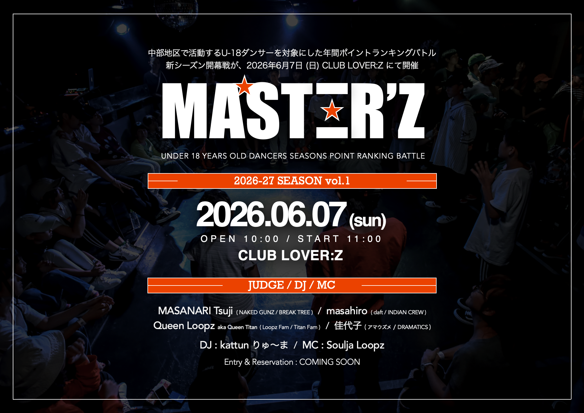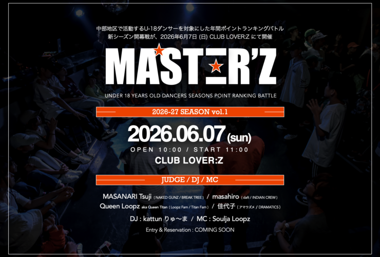 6月072026 BATTLE MAST☆R’Z 2026-27 SEASON vol.1 中部地区で活動する高校生以下のダンサーを対象にした年間ポイント制ダンスバトル『MAST☆R’Z』新シーズン開幕戦が、...