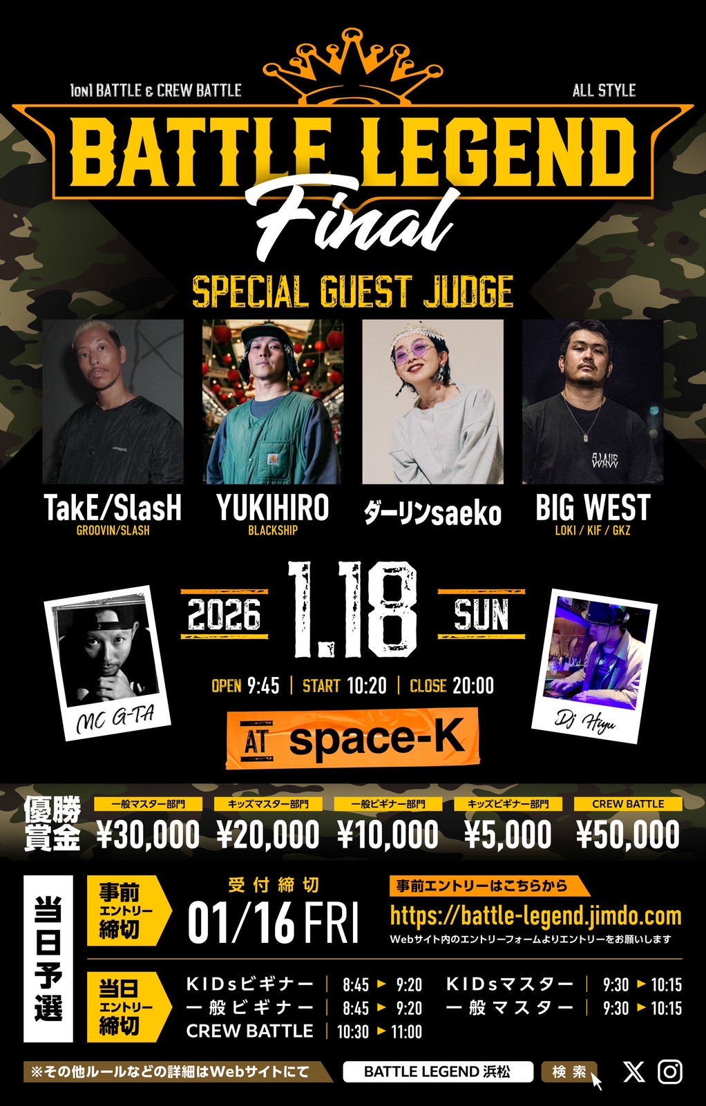静岡・遠州エリア随一の人気を誇るダンスバトル『BATTLE LEGEND』のシーズン・ファイナル&当日予選 が、1月18日(日) 浜松市にある “space-K” にて開催!