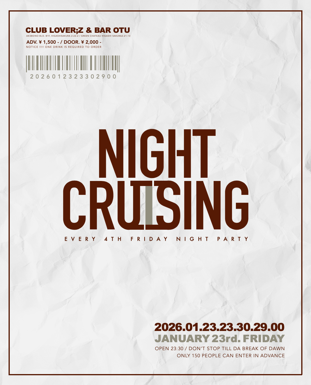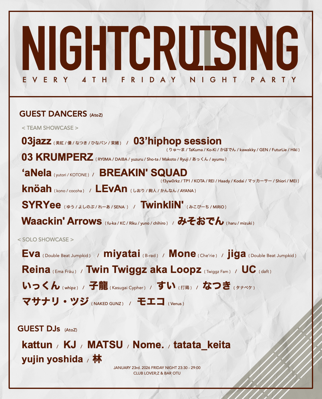東海地区で活動するダンサーなどから人気を誇るダンサーズ・パーティー『NIGHT CRUISING』が、1月23日(金) 名古屋市中区にある CLUB LOVER:Z & BAR 乙 の二店舗で開催!