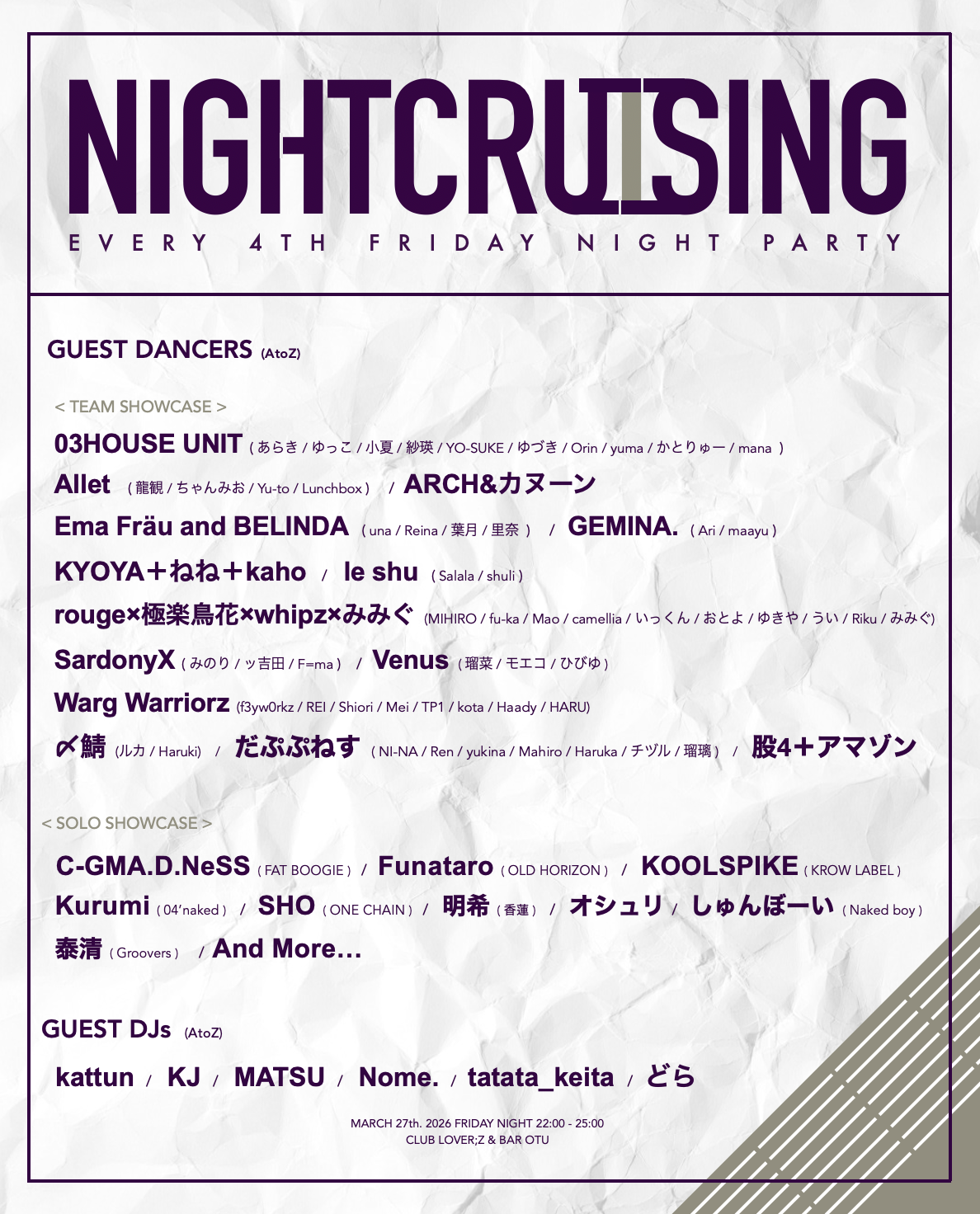 東海地区で活動するダンサーなどから人気を誇るダンサーズ・パーティー『NIGHT CRUISING』が、3月27日(金) 名古屋市中区にある CLUB LOVER:Z & BAR 乙 の二店舗で開催!