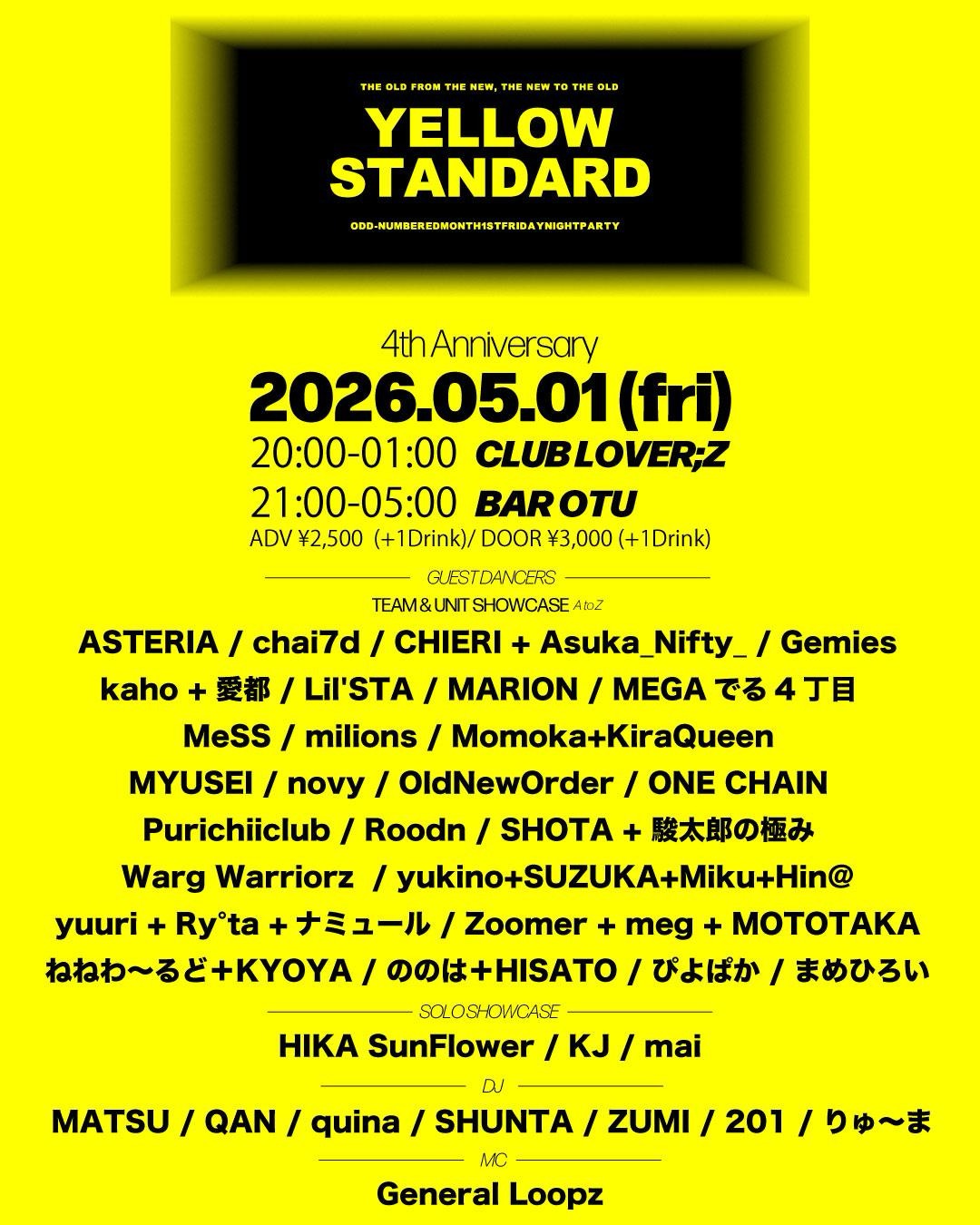 幅広い層のダンサーから熱い人気を集める深夜帯のダンサーズ・パーティー『YELLOW STANDARD』が、5月1日(金) 名古屋市中区にある CLUB LOVER;Z にて開催!