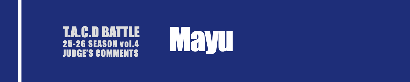 また、音楽へのアプローチの仕方が多彩で『こういう音を表現したいんだな』という考えは伝わりますが、あまりにもわざとらしく見えてしまうため、もう少し素直に音楽を聴いてほしいなと思いました。素直に聴いていれば、音の早取りもないと思います。ただ、ずっと一定のテンポで踊っていてもジャッジの印象には残りません。大学生なので、もう少しジャッジへの見せ方をしっかりと考えても良いのではないでしょうか?『自分の強みは何なのか?どういうものが好きか?』など、自分にもう少し向き合って、存分にアピールしてください。